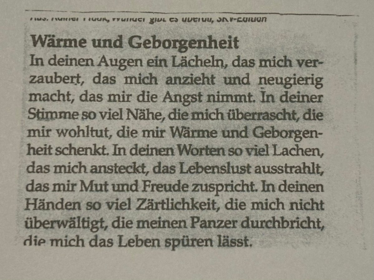 In deinen Augen ein Lächeln, das mich ver-zaubert, das mich anzieht und neugierig macht, das mir die Angst nimmt. In deiner Stimme so viel Nähe, die mich überrascht, die mir wohltut, die mir Wärme und Geborgenheit schenkt. In deinen Worten so viel Lachen, das mich ansteckt, das Lebenslust ausstrahlt, das mir Mut und Freude zuspricht. In deinen Händen so viel Zärtlichkeit, die mich nicht überwältigt, die meinen Panzer durchbricht, die mich das Leben spüren lässt.